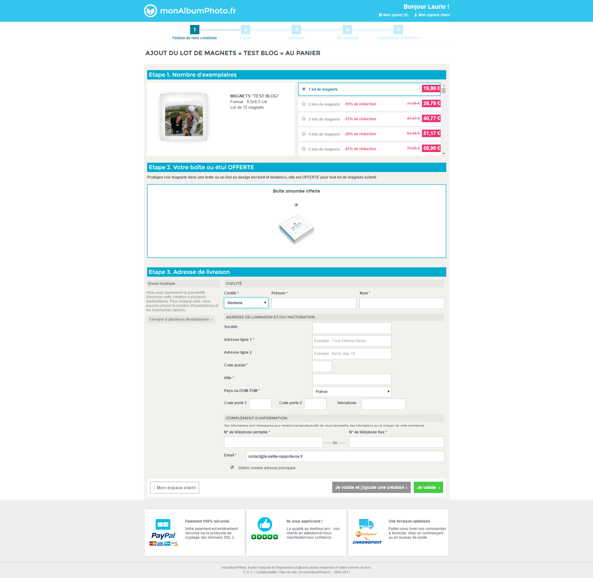 La boîte aimantée offerte est bien mise en avant et les réductions pour commander plusieurs exemplaires sont également bien précisées. Le petit plus : il est possible de commander et d'envoyer les colis à plusieurs adresses différentes ! Voilà de quoi simplifier l'envoi de cadeaux aux grands-parents en période de Noël.